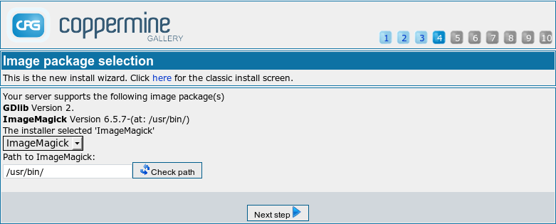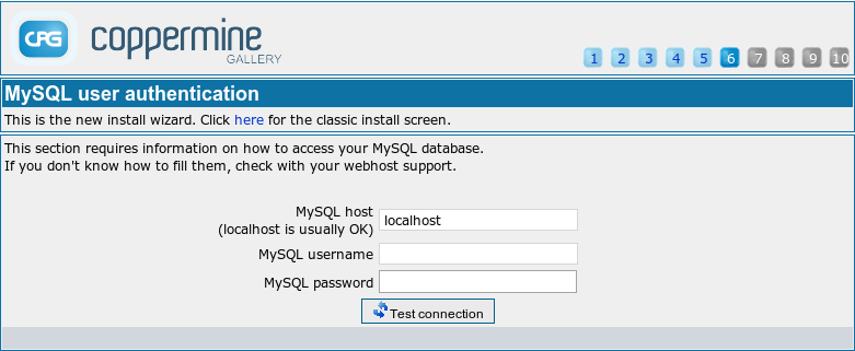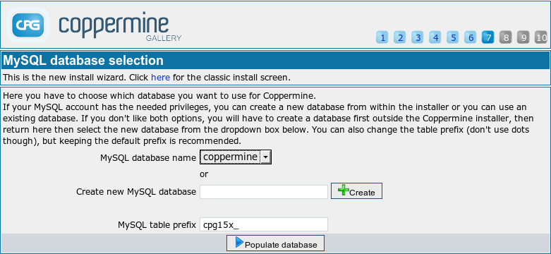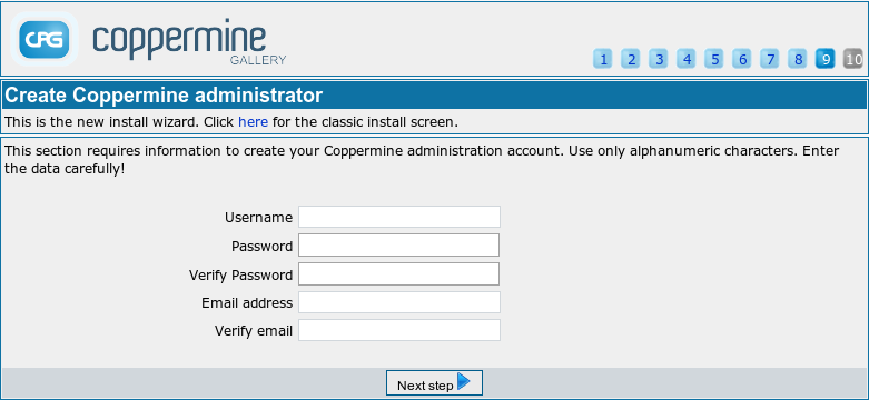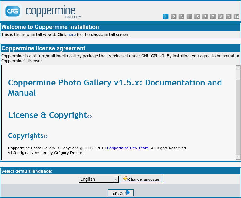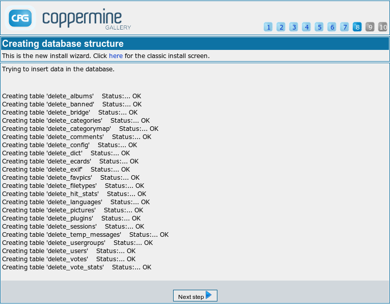 The version cpg1.5.x differs very much from previous versions as much as the install method is concerned: all coppermine versions ever have come with an installer, but in cpg1.5.x the entire install process has been overhauled: the installer now by default has got a wizard-like interface, where you take one step at a time. You're bing led through the entire install process using the wizard, which is a great improvement for beginners. However, if you are a coppermine expert and know your way around the application, you can still use the old install screen: we have bundled it with the package under the name "classic installer". Please understand that it goes unsupported though: if you have issues during install and want support, use the new installer. Questions related to the old installer will not be answered on the coppermine support board. Of course the old installer doesn't have all features that the new installer has: it doesn't create a database for you etc.