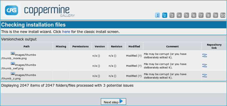 Click on "next step" if all files are up to date or if you don't want to use the most recent release (or rather: if you know your way around good enough to be sure that what you're about to install is actually what you want). In fact what happens in this step is that an embedded copy of the version check script is being run that comes with Coppermine to determine if your copy of Coppermine that you're about to install is up-to-date, as you would not want to install an outdated copy to start with.