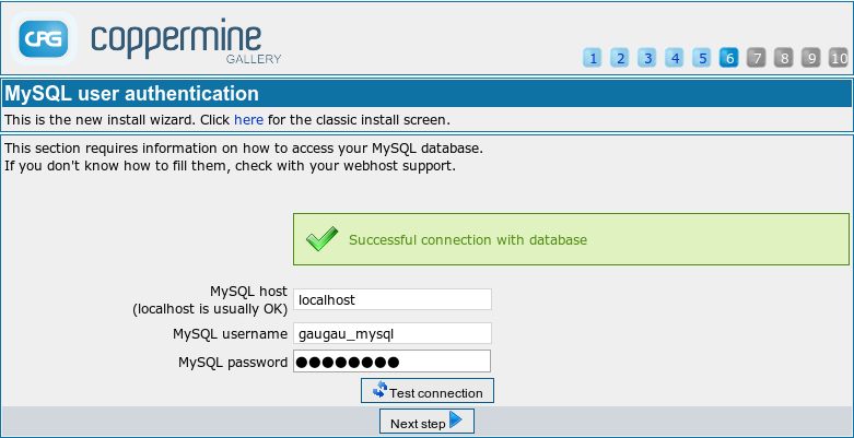 Underneath the input fields you will find a button to test the connection - if you click that button, a test is performed to see if the data you have entered is correct. If it is, a message that says "Successfull connection to database" will be displayed (see screenshot), and you can continue to the next step. If the test is not successfull, you will need to review your mySQL authentification settings.
