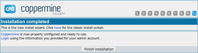 Starting with cpg1.5.x coppermine comes with a wizard-like installer that will lead you through the entire install process. Below are the steps of the install wizard, with one chapter per wizard step.